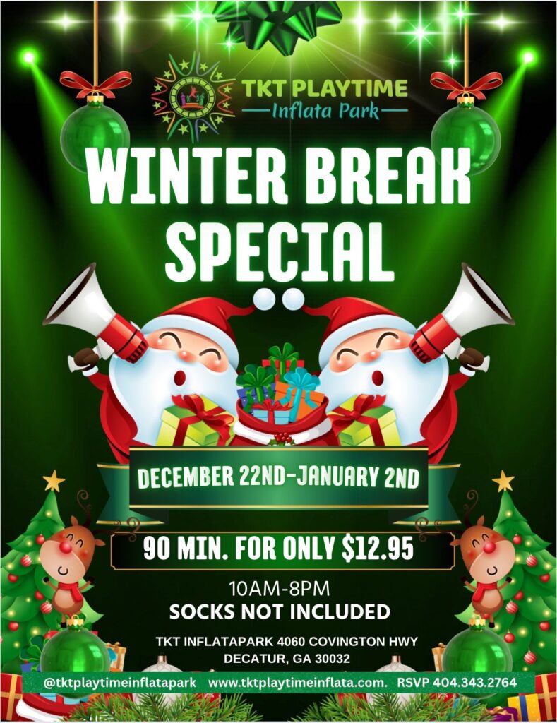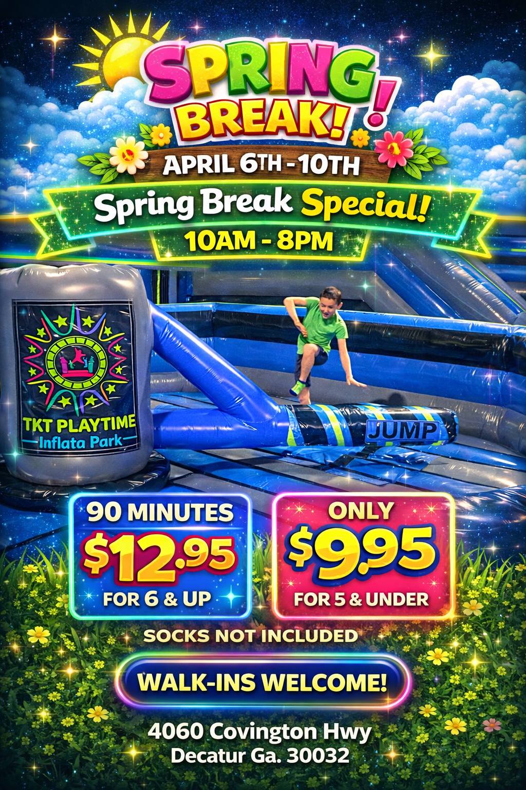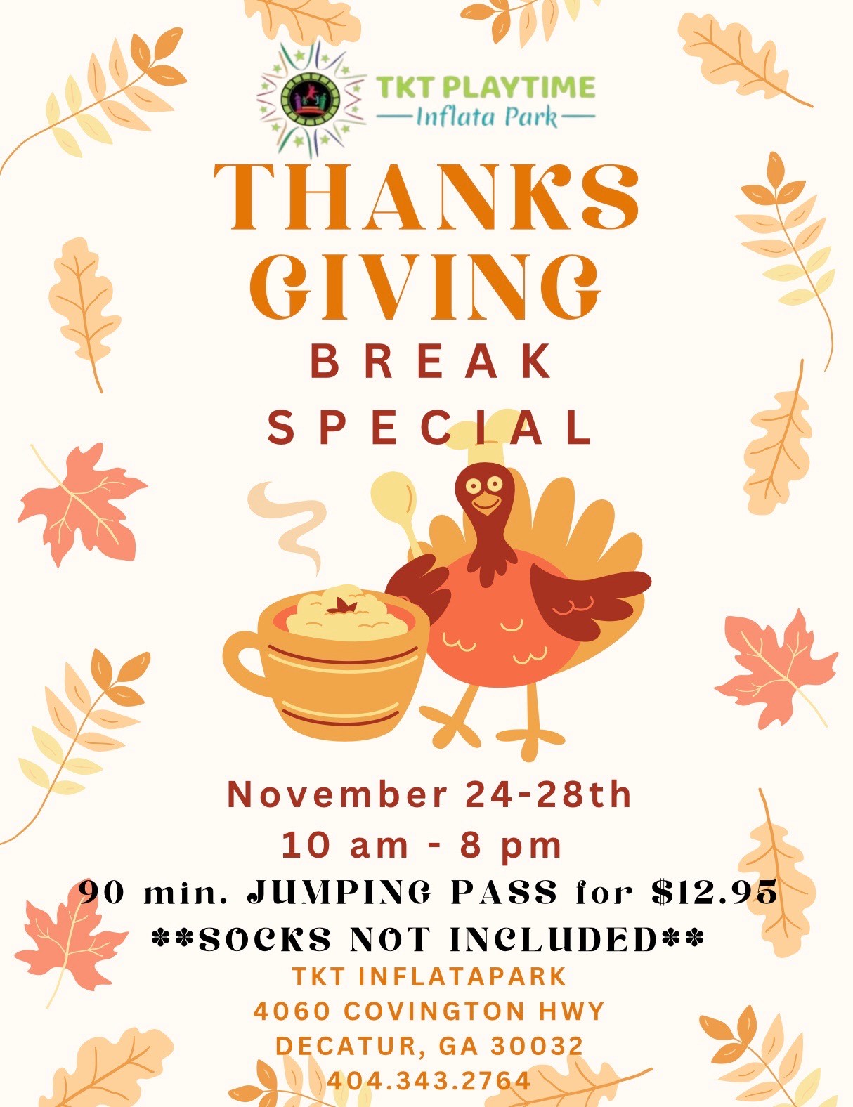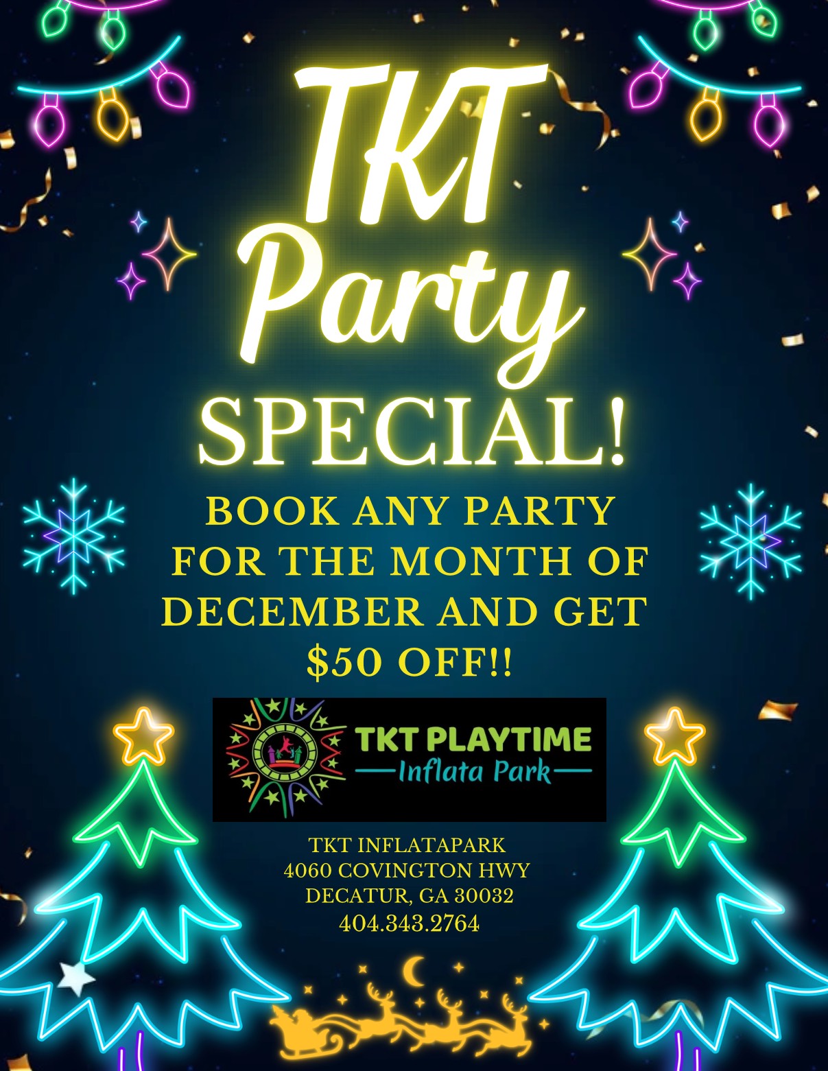 TKT Playtime Inflata Park is a family-owned entertainment facility. Starting out as a family-owned business offering inflatable products, TKT Playtime Entertainment has flourished into a known and respectable brand. Our business offers corporate events, birthday parties, family reunions, class reunions, and more.We are now proud to now offer a 20,000 sq foot facility located in Decatur, Georgia. Our goal is to be a leading provider of fun and excitement, all within a safe environment for any occasion and all ages. Visit us today and enjoy a true jumping experience.